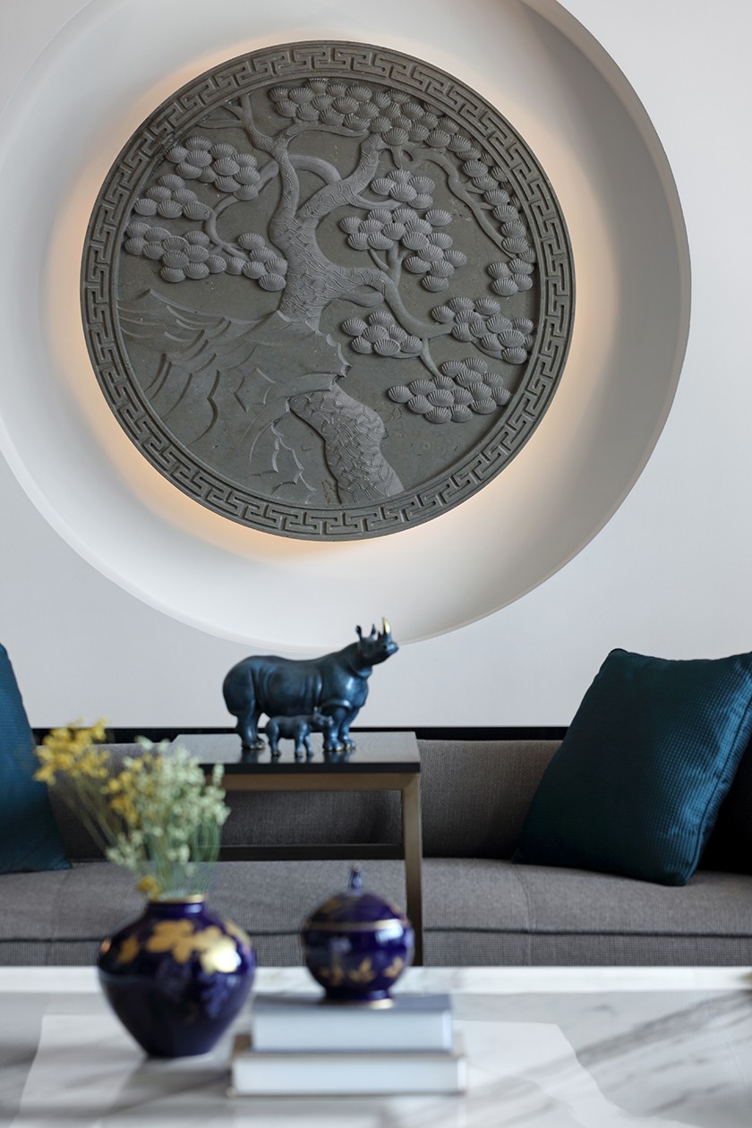 东方礼序理念,将上善若水的包容一脉相承。把繁藏静,把方寸埋进肺腑。闲闲着笔,缓缓为之。引竹入室,幻化万象,虚实相生的朦胧意境。“奢雅”调,通过光影渲染给空间注入力量与生命灵性。圆形玉石宛芳一轮明月,精选晶石及用料,图案和肌理彰显出巨大的张力,有种纷纷世态长松影,荏苒时光流水声。餐厅以人文精神为依据,渐变背景与深色木系,回应了轴线关系,空间点线凸显传统元素的雕琢,别具匠心。