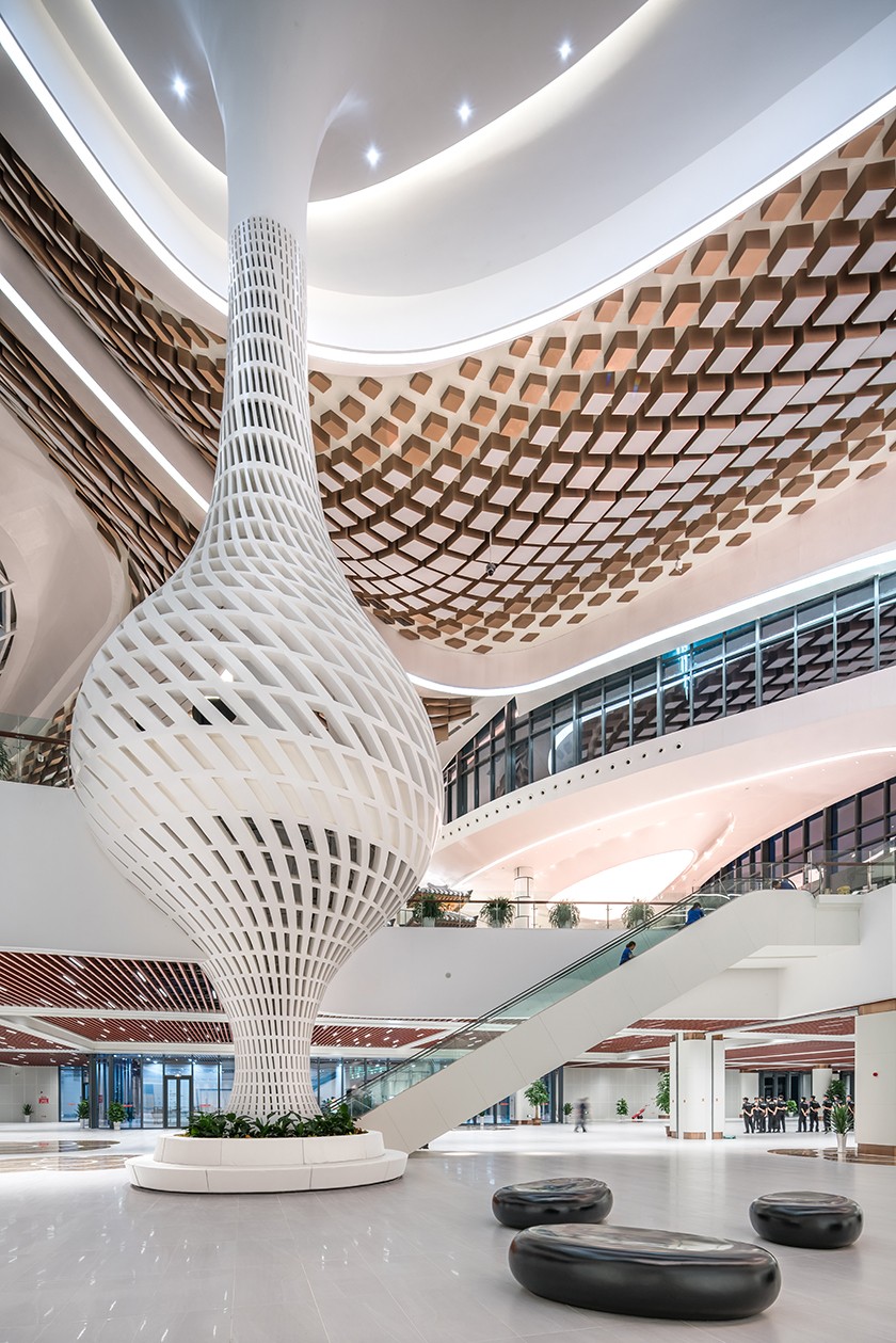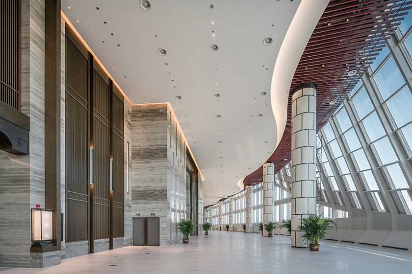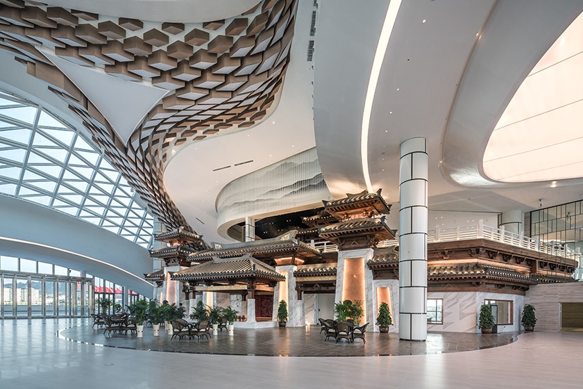 室内方案将建筑上的流线元素引入室内,并将青岛海洋的特点融入其中,在形式上体现出如同海浪一般的流线造型,并在局部引入金色的鱼群形成独特的灯具造型。在大厅公共区域,打造出结合当地琅琊台文化的建筑休闲区域,细节的体现了琅琊台传统文化的主题概念,彰显出琅琊台丰富的人文文化,赋予空间厚重的历史感。